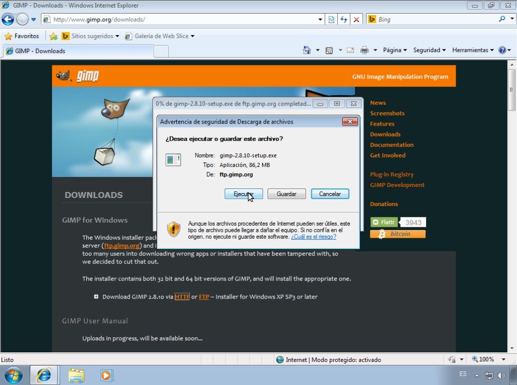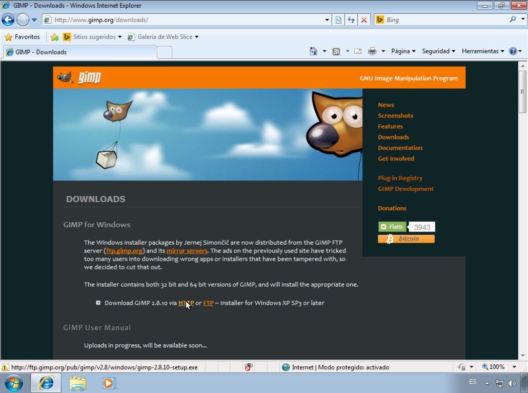 Empecemos entrando en la página oficial de GIMP en el área de descargas (http://www.gimp.org/downloads) y hacer clic en el enlace de Descargar (Download) vía HTTP o FTP, cualquiera es válido. En este caso vamos a descargar la versión disponible en el momento que es la 2.8.10.