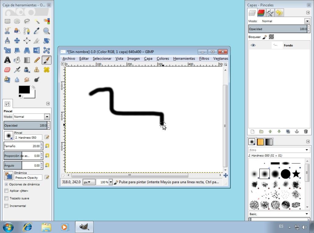 Una vez creado, vamos a dibujar con la herramienta pincel un trazo cualquiera. Las herramientas están en la ventana lateral derecha llamada Caja de herramientas. Pulsa sobre el pincel y luego dibuja algo en la nueva imagen.